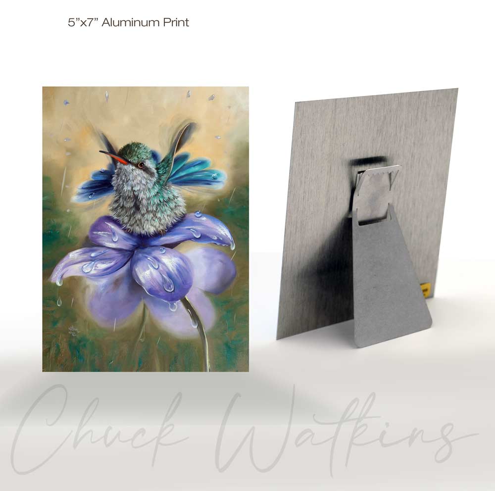 For the 5"x7" aluminum prints, they can sit or hang with the aluminum laser-cut easel back.