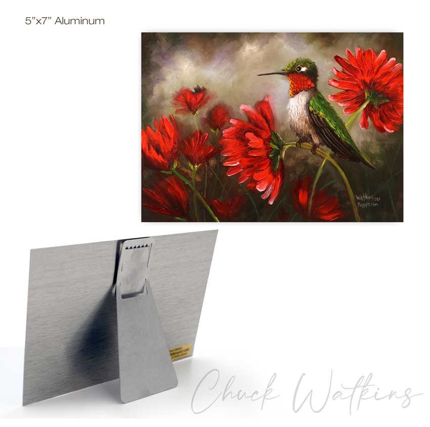 For the 5"x7" aluminum prints, they can sit or hang with the aluminum laser-cut easel back.