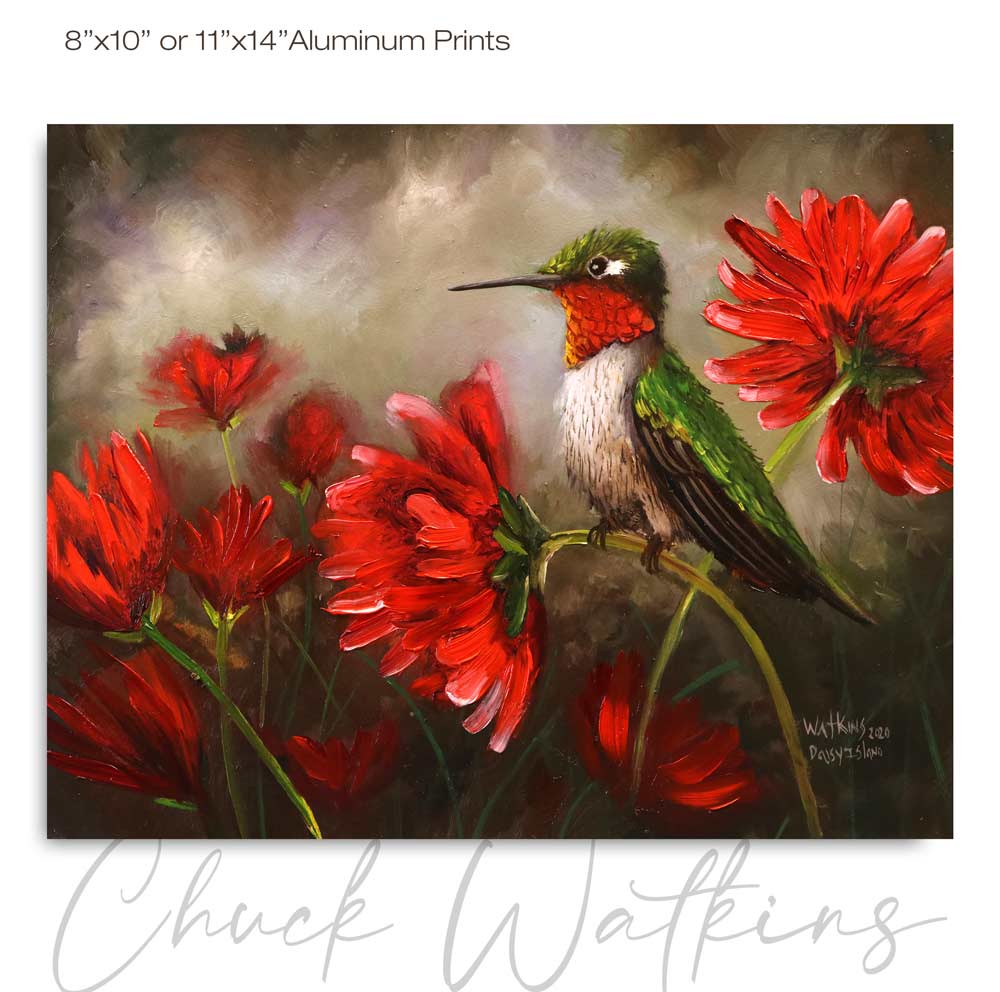 Daisy Island captures a delicate moment as a ruby-throated hummingbird hovers among blooming flowers, wings shimmering in iridescent greens and reds. This charming piece celebrates nature's tiniest jewel in its element, surrounded by soft petals and vibrant botanicals. Perfect for hummingbird lovers and nature enthusiasts, it brings the magic of these remarkable creatures right into your space with playful elegance and wonder.