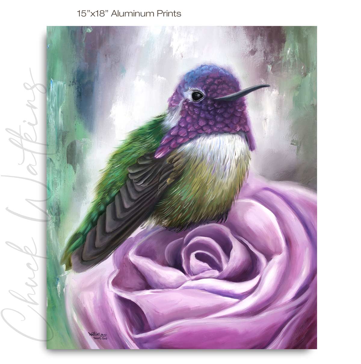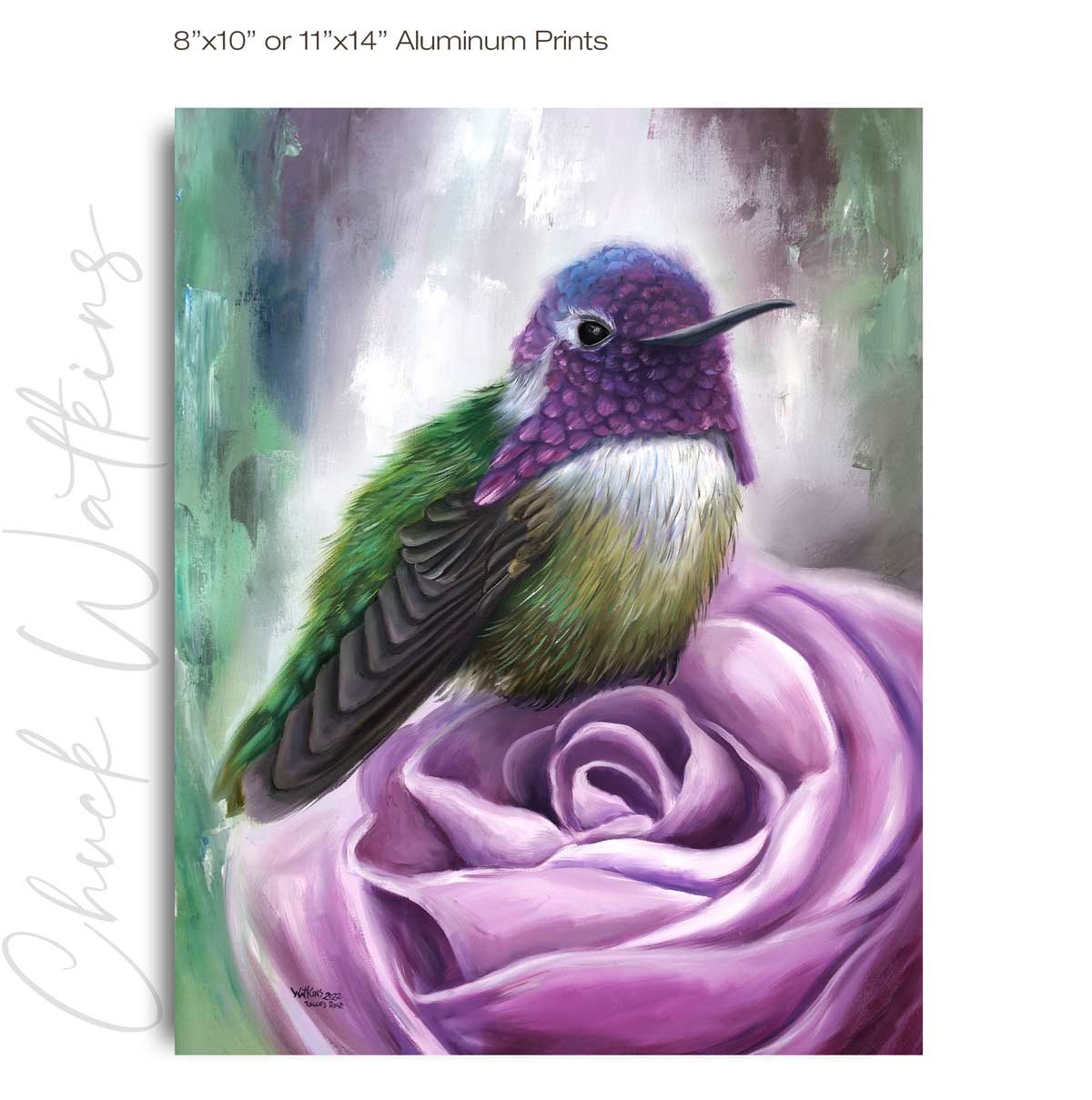 Meet Rocco's Rose—where a dazzling Costa's hummingbird takes center stage on a blooming rose. This whimsical artwork captures the bird's shimmering emerald and violet plumage as it perches among velvety petals, frozen in a moment of pure enchantment. The playful composition celebrates the romance between nature's tiniest acrobat and one of its most beloved flowers. Ideal for those who adore hummingbirds, botanical beauty, and art that brings a smile.