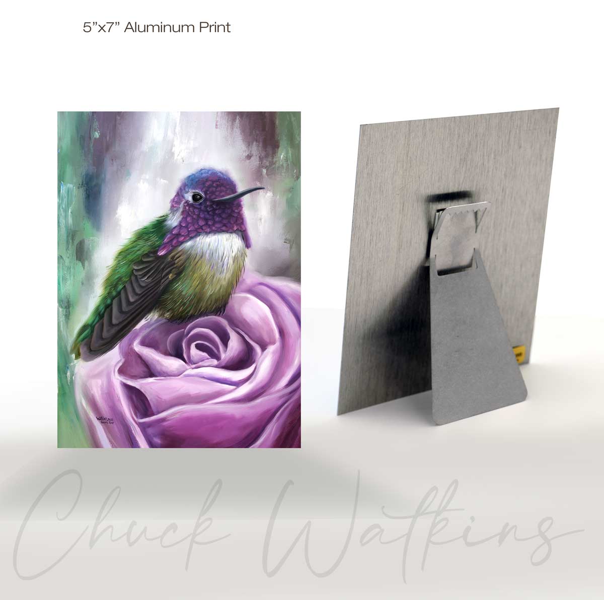 For the 5"x7" aluminum prints, they can sit or hang with the aluminum laser-cut easel back.
