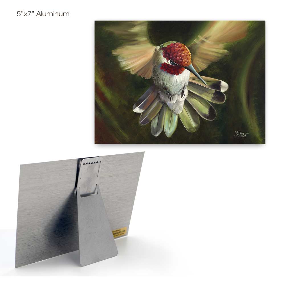 For the 5"x7" aluminum prints, they can sit or hang with the aluminum laser-cut easel back.