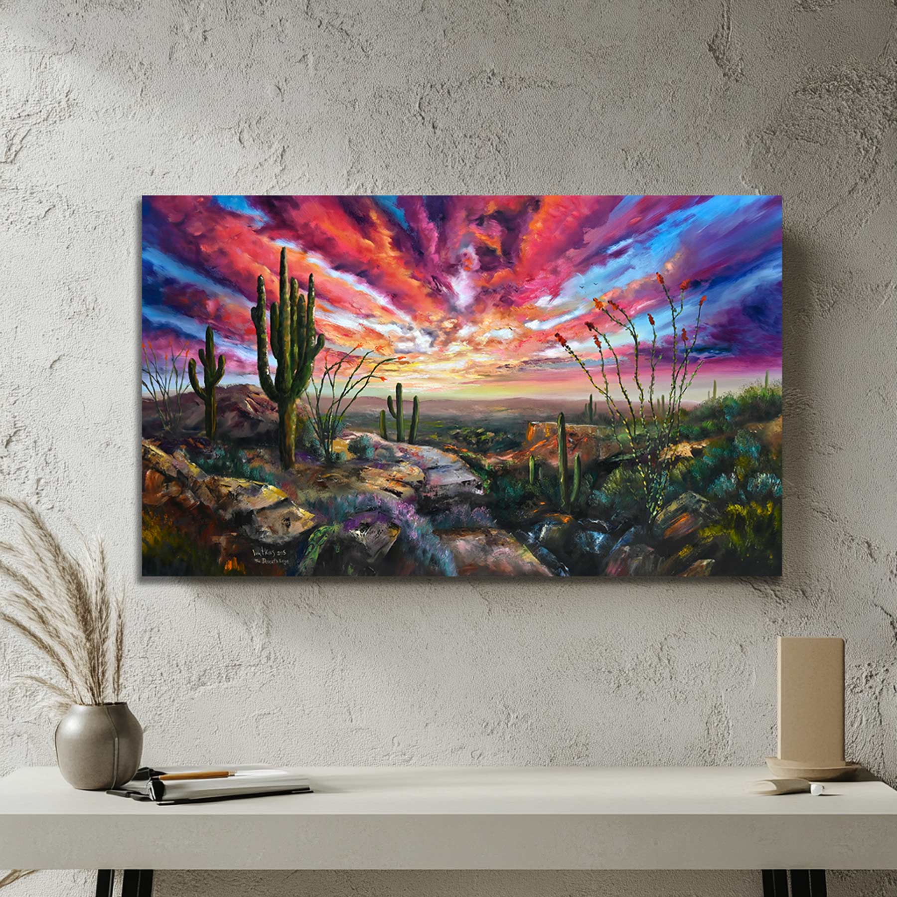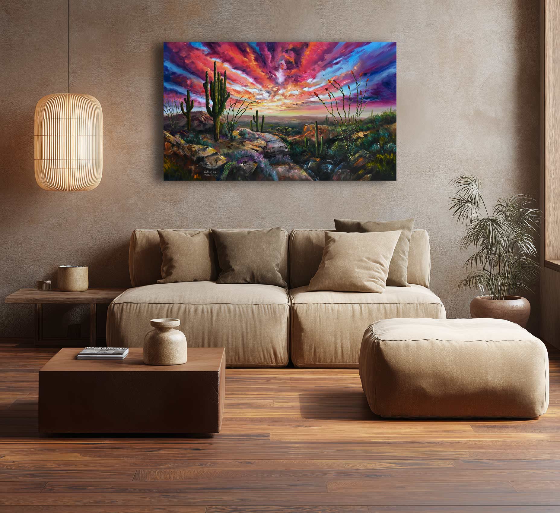 The Desert's Edge captures a transformative landscape where elevation shifts and saguaro forests give way to open terrain. This striking composition reveals nature's invisible boundaries—the precise point where altitude and climate converge to reshape the desert floor. Witness the dramatic transition from thriving cacti to sparse vegetation, a visual testament to how geography orchestrates life itself. Perfect for collectors who appreciate art that illuminates the dynamic forces shaping our natural world. A compelling meditation on ecological thresholds and environmental change.