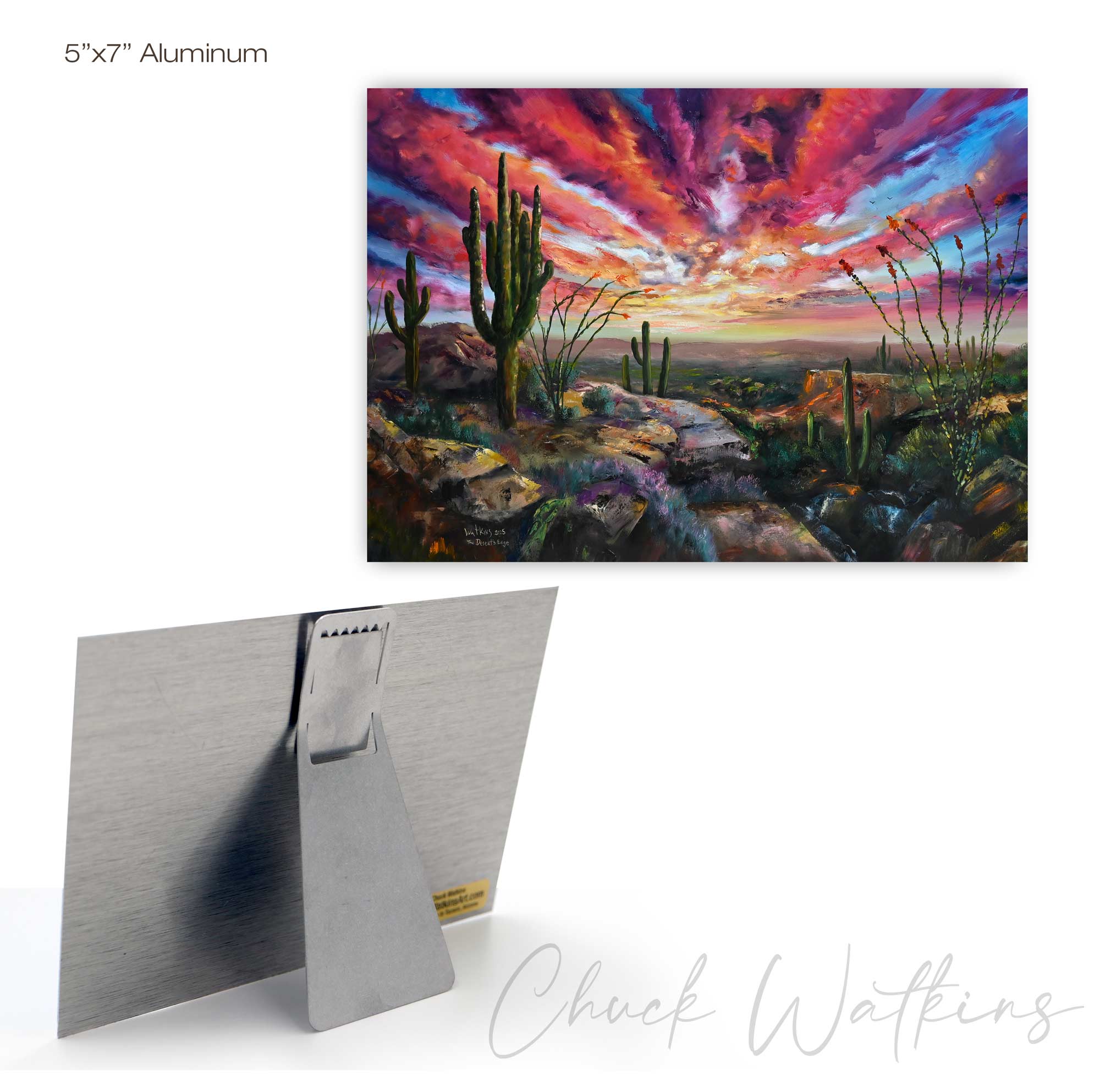 For the 5"x7" aluminum prints, they can sit or hang with the aluminum laser-cut easel back.